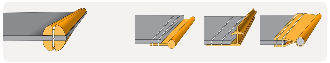 Der NonVi Twin besteht aus zwei Halbkedern mit Nut. Das Gewebe wird zwischen die Kederhälften geführt, vernäht und kraftschlüssig miteinander verbunden.