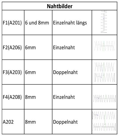 Besonderheiten: - grössere Multilayer Tischplatte 110 x 69cm - angepasstes Stichloch - inklusive 3 Nahtprogramme für 6, 8 und 10mm Aufzugsbänder. - weitere kundenspezifische Nahtprogramme auf Anfrage.
